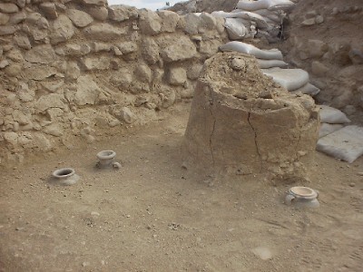 Propaly the kitchen, this room contains sunken jars in the ground - a known technique to keep the water cooled, and an oven. |